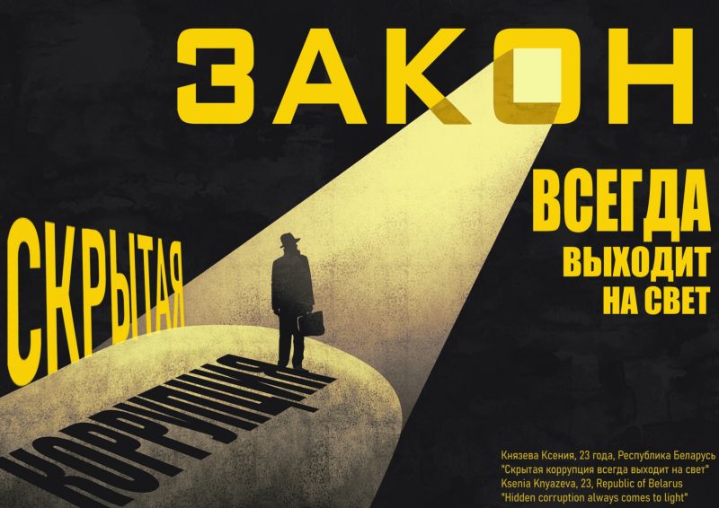 Работа старшего инспектора отдела таможенных операций и контроля № 1 Бобруйского таможенного поста Могилевской таможни Князеевой Ксении «Скрытая коррупция всегда выходит на свет» победила на национальном этапе конкурса в номинации «Лучший плакат» в возрастной категории 21-25 лет, а также была отмечена сертификатом участника на международном уровне.