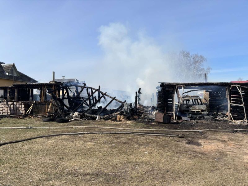 В результате пожара уничтожен гараж, автомобиль в нём, сарай, повреждена крыша в сарае, закопчены стены. Спасено 1 хозяйственная постройка, 1 дом. Пострадавших нет.